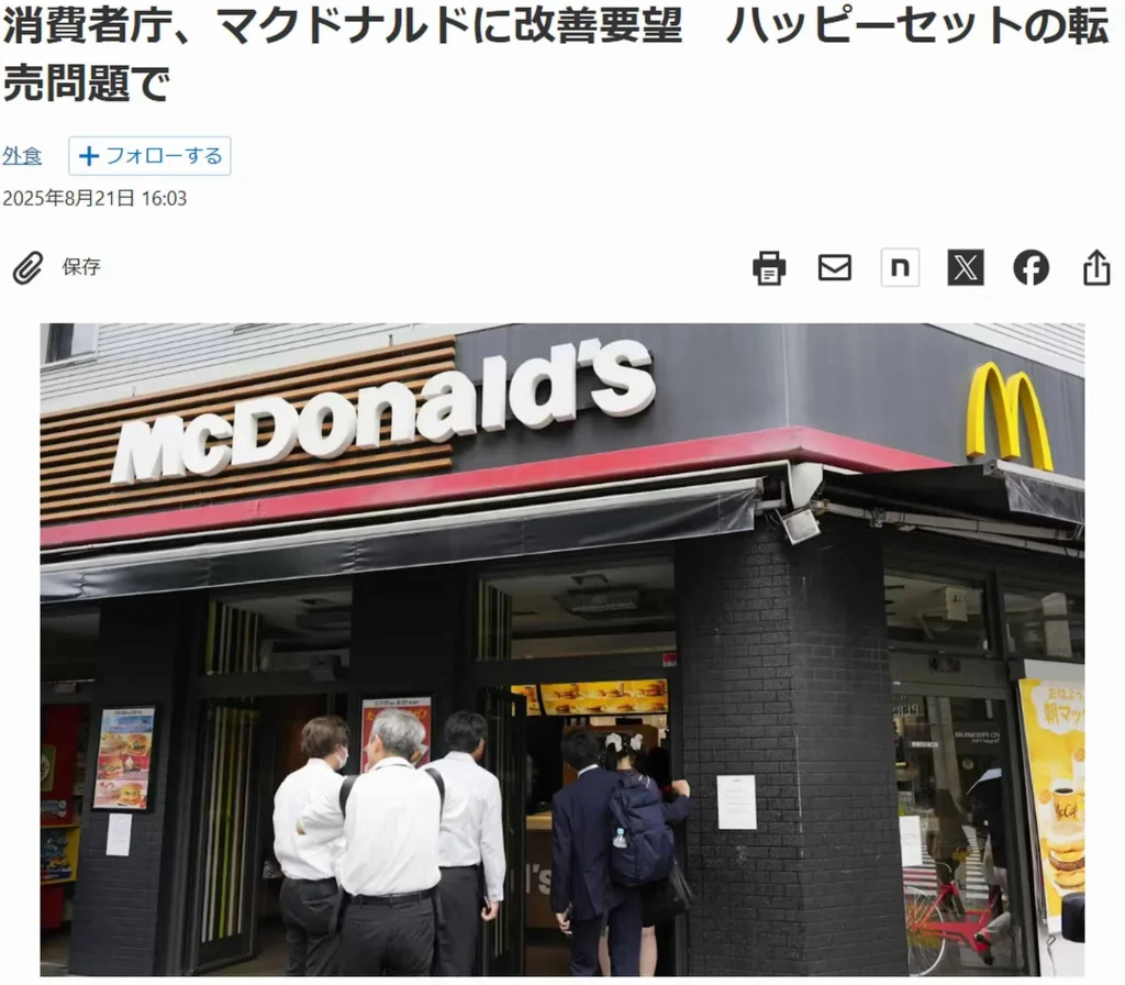 場合によっては、マクドナルドのハッピーセット転売問題のように、消費者庁から企業に改善要望が出ることもあります。