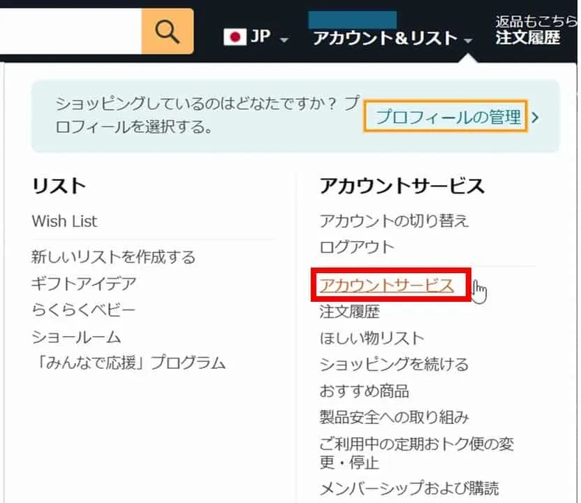 ①Amazonの画面右上の「アカウント&リスト」から「アカウントサービス」を選択する