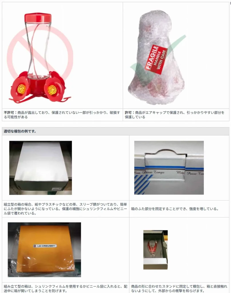 - 梱包することで、商品の鋭利な部分や先端を完全に覆う必要があります。