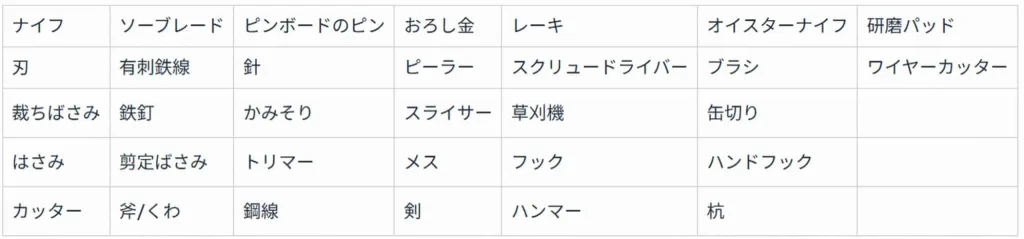 鋭利な部分を持つ商品とは、たとえば次のような商品を指します。