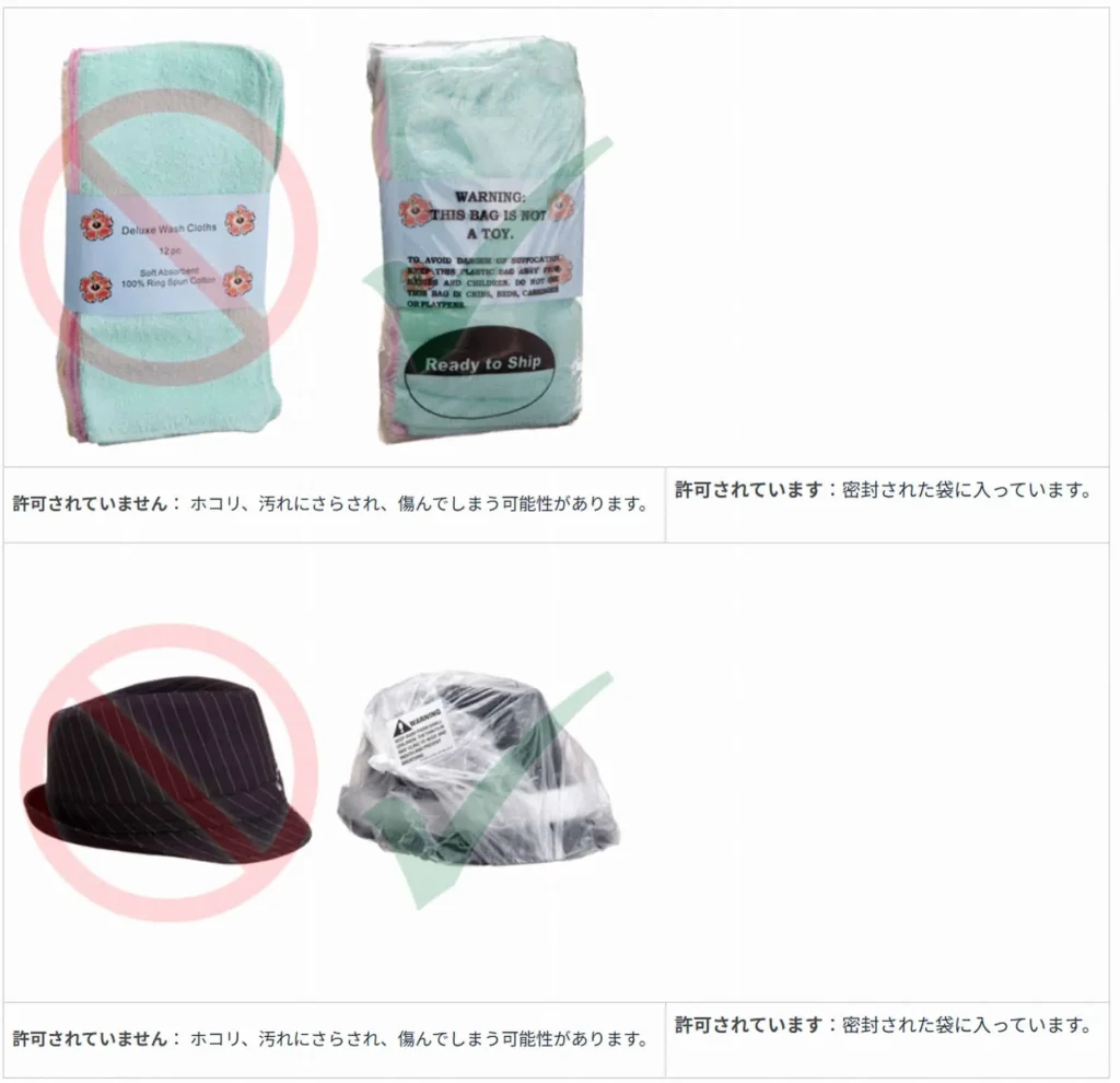 シャツ、バッグ、ベルト、ぬいぐるみなど、布や繊維で作られ、汚れ、ホコリ、湿気、液体でダメージを受ける可能性のある商品は、以下の梱包要件を満たす必要があります。