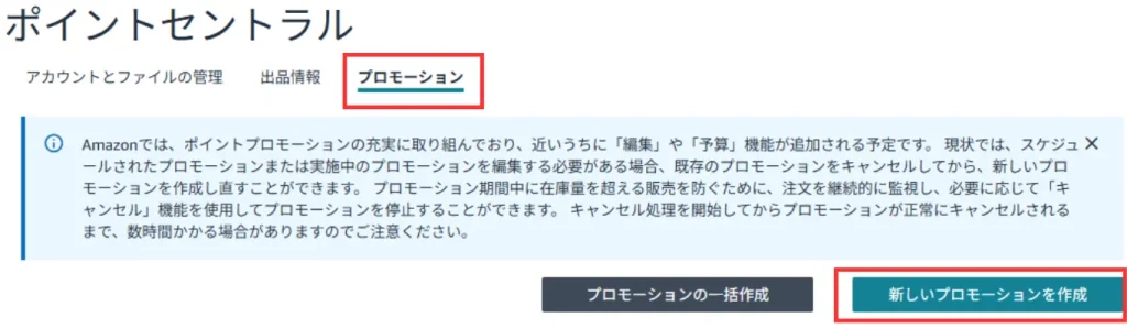 ②ポイントセントラル画面で「プロモーション」のタブをクリックし「新しいプロモーションを作成」をクリックします。
