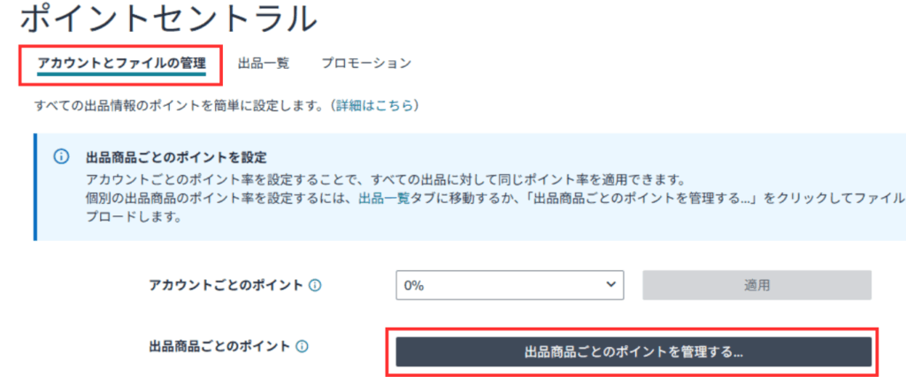 「アカウントとファイルの管理」画面で、「出品商品ごとのポイントを管理する」をクリックして、商品リストをダウンロードし、ポイント変更後アップロードする。