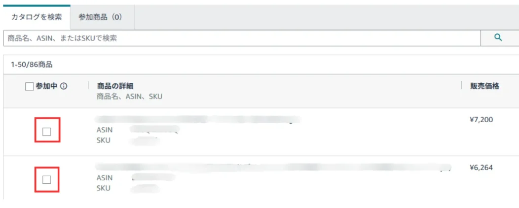 ④「参加商品を選択」で上記の設定内容を適用したい商品を選択し☑します。