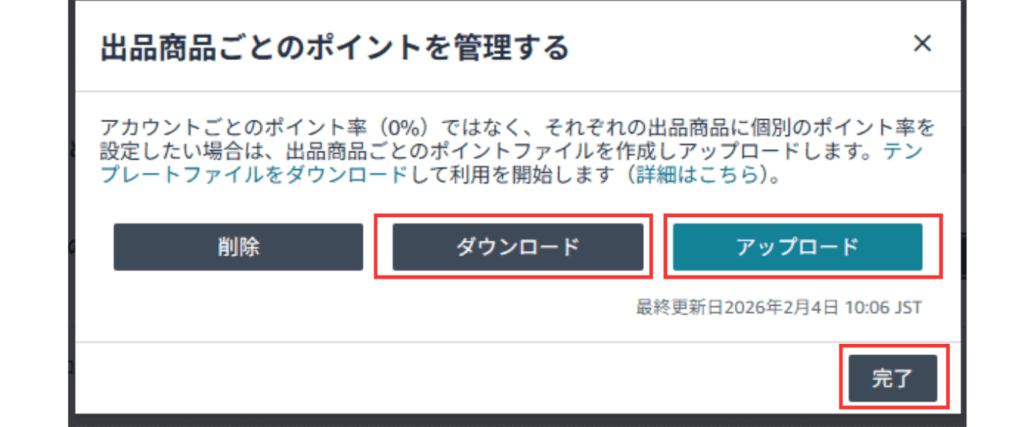 上記の②の手順でお伝えしたように、ポイントセントラル画面の「アカウントとファイルの管理」画面で、「出品商品ごとのポイントを管理する」をクリックし、商品リストをダウンロードし80%以上にポイントが付与されていれば完了です。