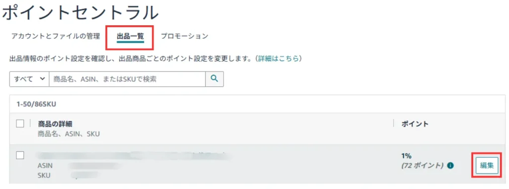 「出品一覧」画面で、変更したい商品ごとに右端にある「編集」をクリックし、ポイントを変更して「適用」をクリックする。