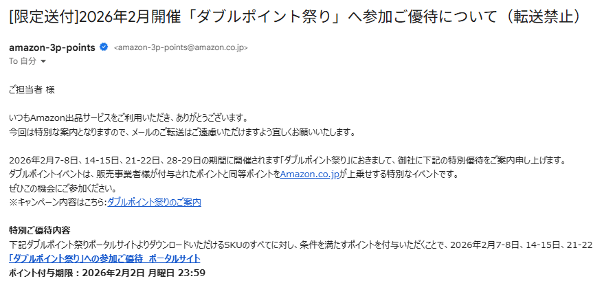 招待メールは、Amazonポイント祭り開催の5~10日前に届きます。