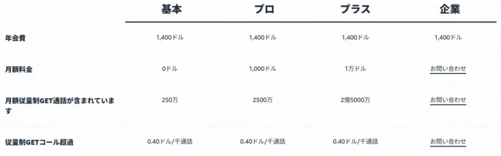 上記のように、どのプランでも1,400ドル(1ドル150円換算で21万円)の年会費がかかり、プランに応じて0~1万ドルの月額料金がかかるようになっています。
