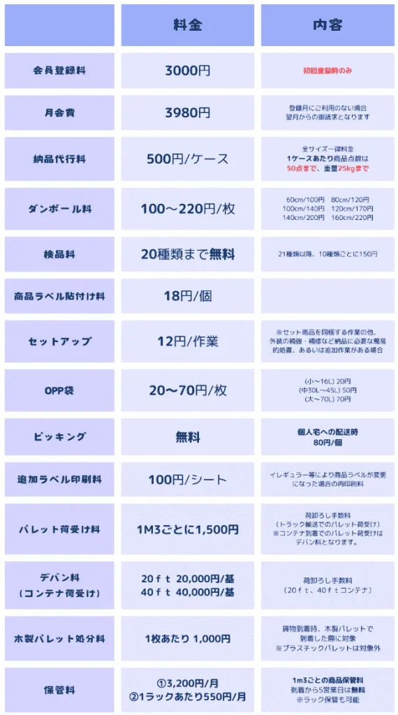 その他、要期限管理商品、危険物、セット商品の取扱いはできますが、すべてオプション料金が発生します。