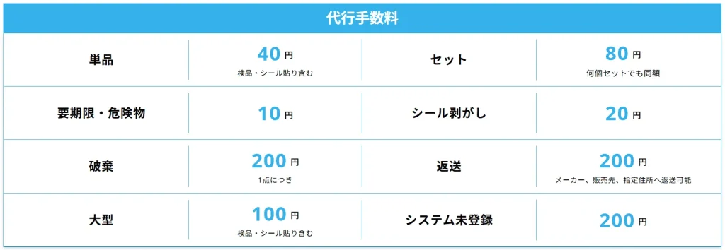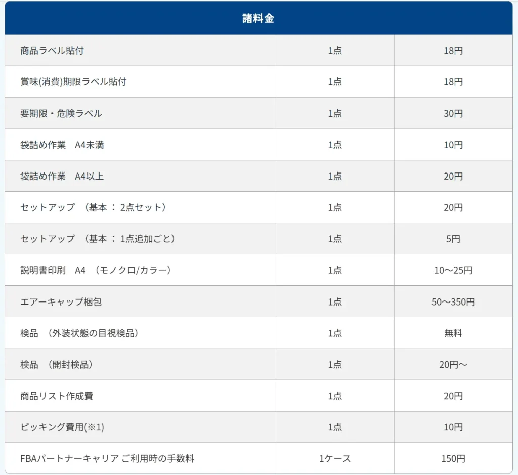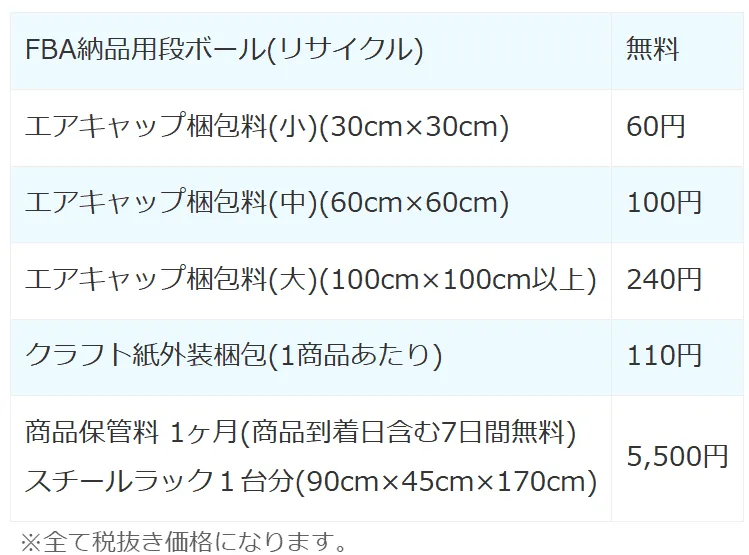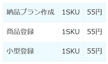 FBA納品代行のサービス利用料は次の通りとなっています。