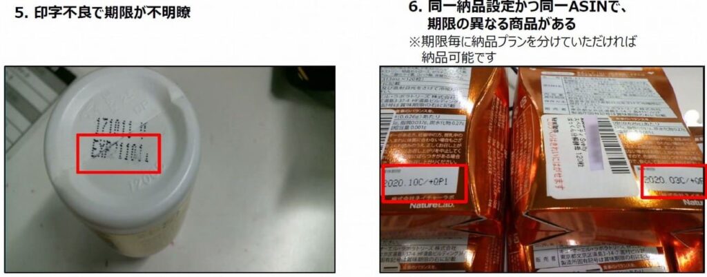賞味期限/消費期限の印字がAmazonのルールに適していないと、納品不備になってしまい返送されます。