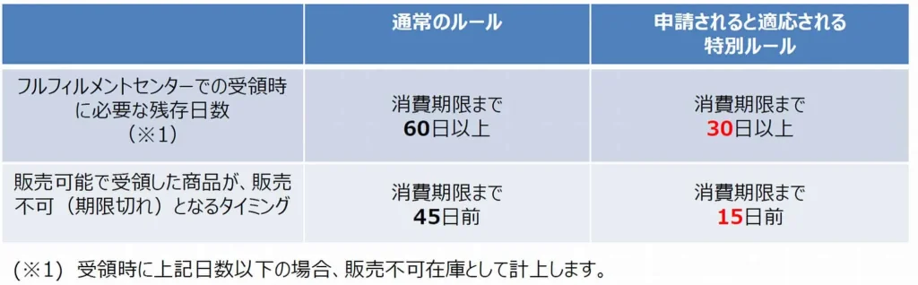Amazonでは申請することによって、下図のような特別ルールが適用され、受領時に賞味期限が30日以上残っていれば納品できますし、15日以下になるまでは販売ができるなどルールが緩和されます。