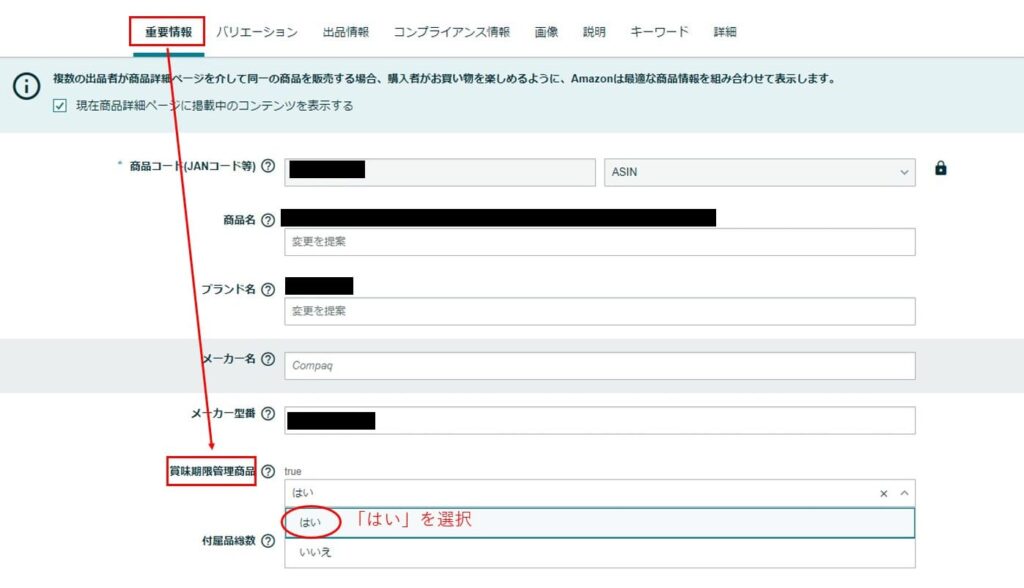 ③「重要情報」→「賞味期限管理商品」で「はい」を選択し、ページ一番下の「保存して終了」をクリック