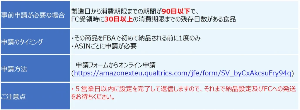 | 申請のタイミング | ・その商品をFBAで初めて納品される前に1度のみ ・ASINごとに申請が必要 |