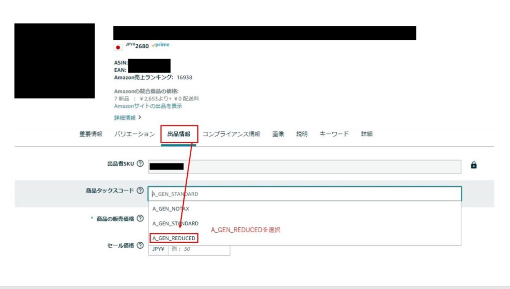 ③「出品情報」→「商品タックスコード」でA_GEN_REDUCEDを選択し、ページ一番下の「保存して終了」をクリック