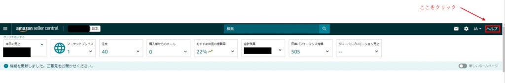 ①セラーセントラルトップページの右上の「ヘルプ」をクリック