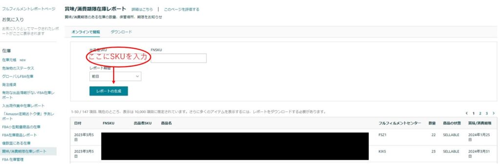 ③確認したい商品のSKUを入力し「レポートを生成」