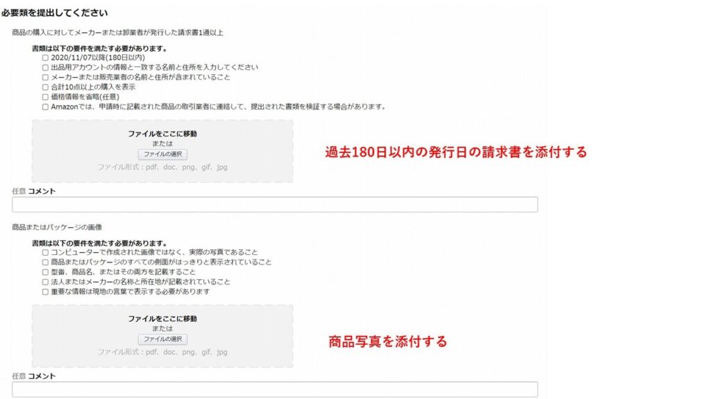 ④ここでは、過去180日以内に発行された請求書と商品写真を添付します。