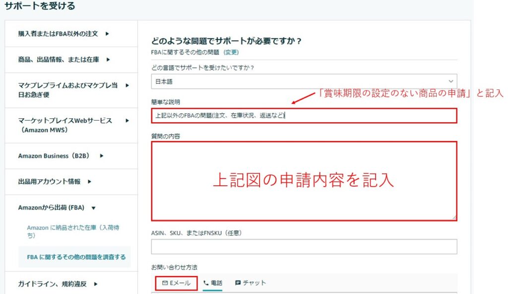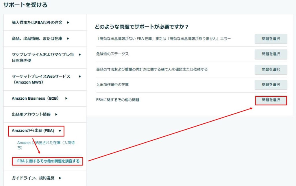 ⑤「Amazonから出荷(FBA)」→「FBAに関するその他の問題を調査する」→「FBAに関するその他の問題」の順にクリック