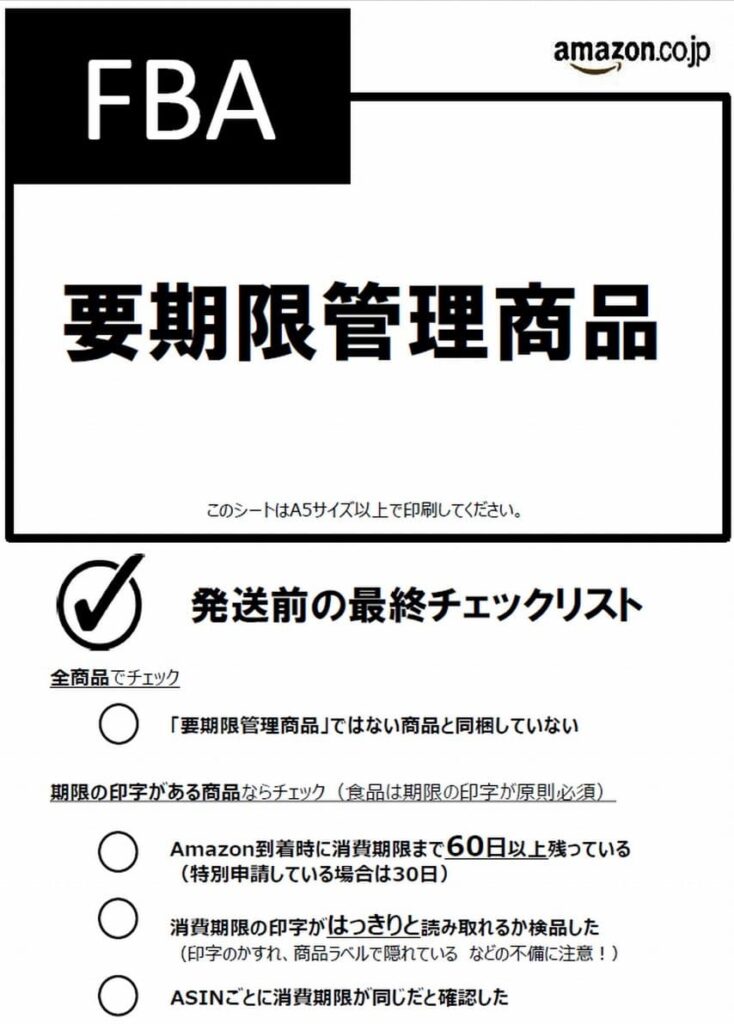 Amazon FBAでは、賞味期限/消費期限のある商品を要期限管理商品と言いますが、通常の納品ルールに加えて、次のことを守る必要があります。