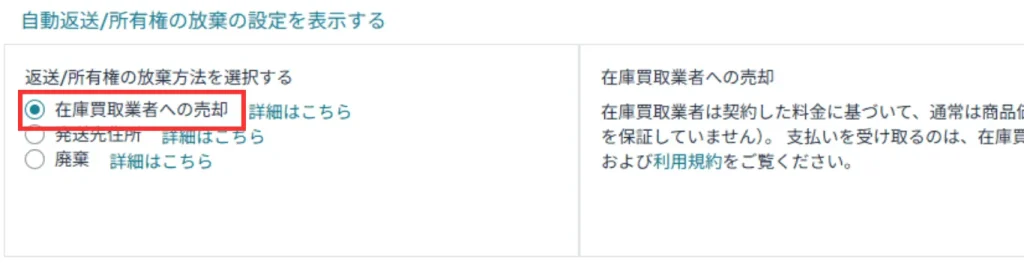 ④「返送/所有権の放棄依頼の作成」画面で「在庫買取業者への売却」を選択します。