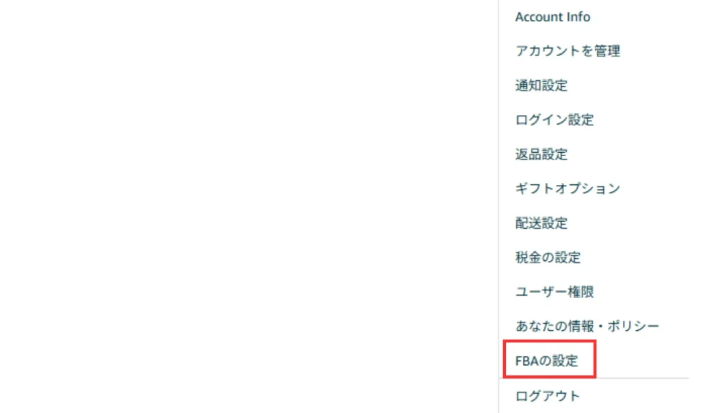 ①セラーセントラルの右上設定⚙マークをクリックし「FBAの設定」をクリックします。