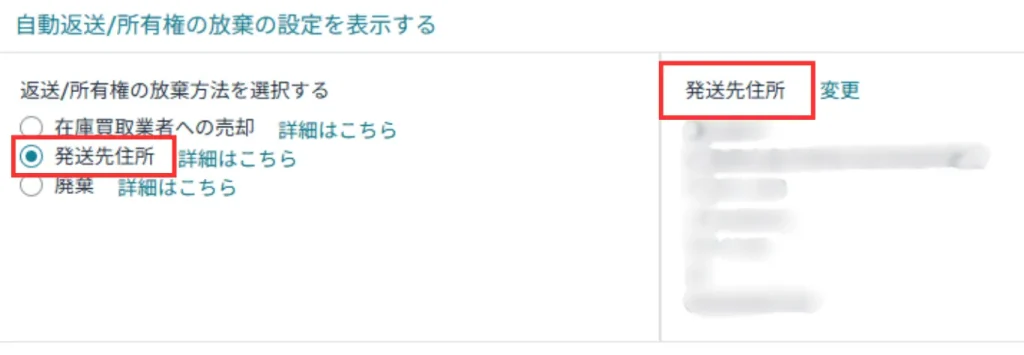 ④「返送/所有権の放棄依頼の作成」画面で「発送先住所」を選択し、返送先情報を入力します。