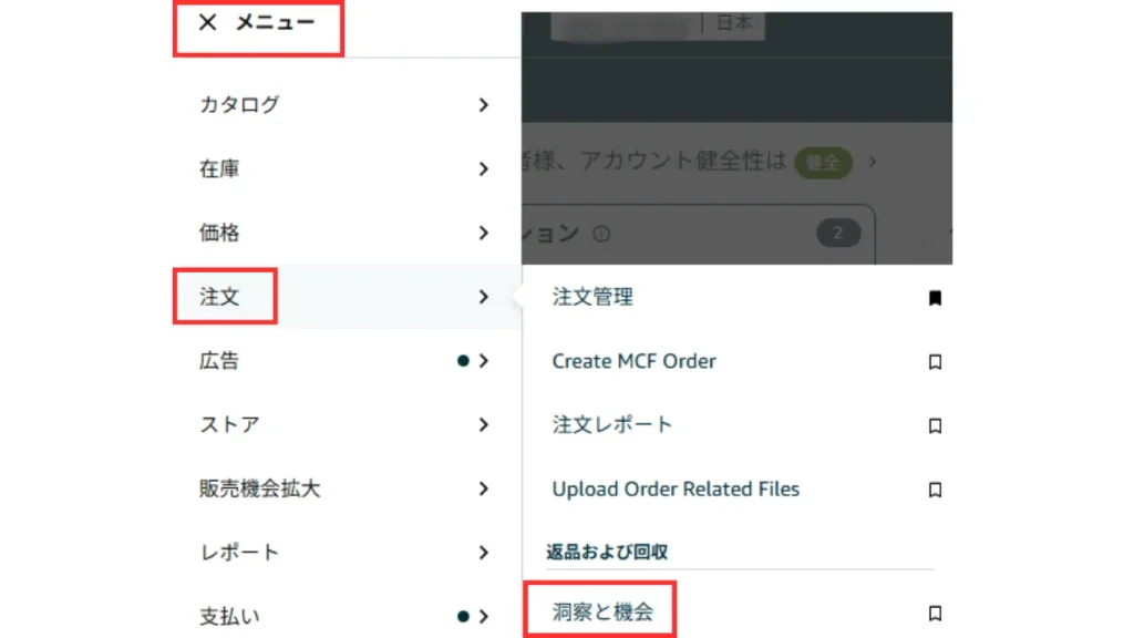 ①セラーセントラルトップページの「左上三本線」のメニューをクリックし「注文」→「洞察力と機会」をクリックします。