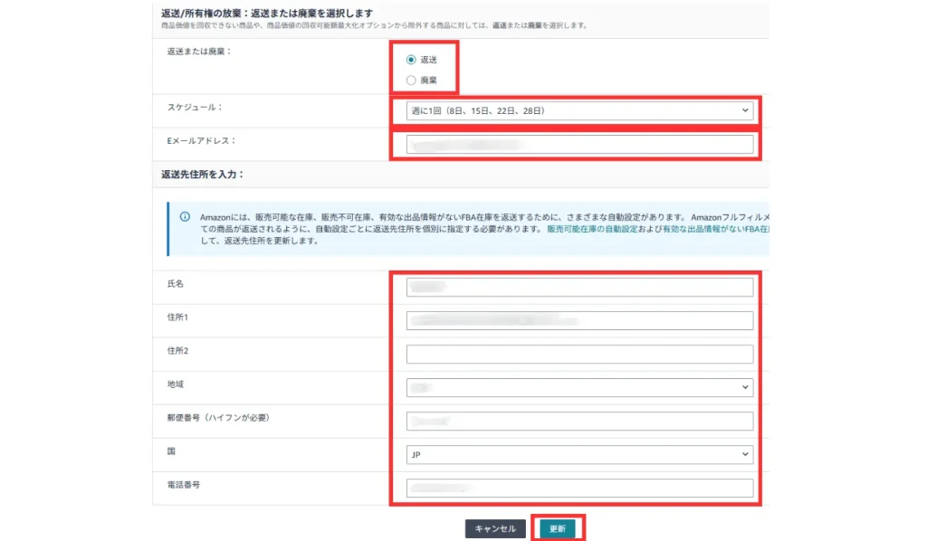 ④「返送/所有権の放棄:返送または廃棄を選択します」の欄の「返送または廃棄」のどちらかに◎し、「スケジュール」「Eメールアドレス」「返送先住所を入力」欄に情報を入力しし「更新」をクリックすれば完了です。