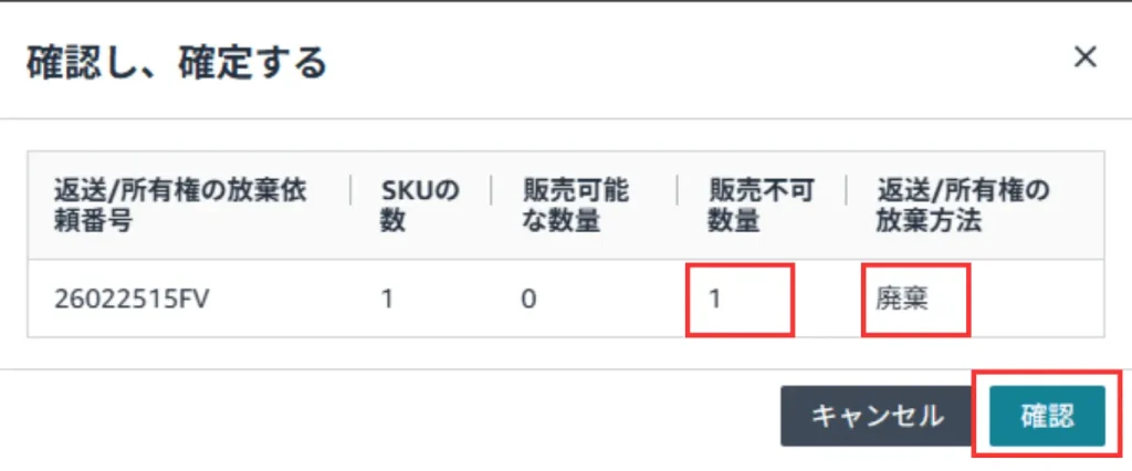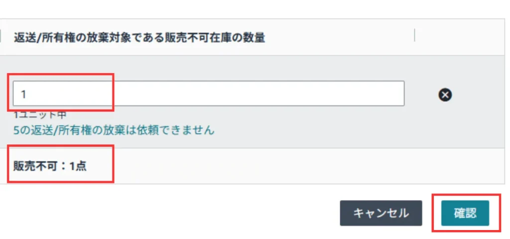 ⑤「返送/所有権の放棄対象である販売不可在庫の数量」の下に「販売不可:○点」と記載されている数量以下を入力し「確認」をクリックします。