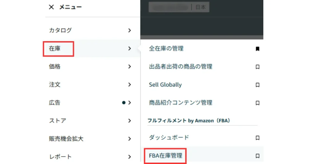①セラーセントラルトップページの「左上三本線」のメニューをクリックし「在庫」→「FBA在庫管理」をクリックします。