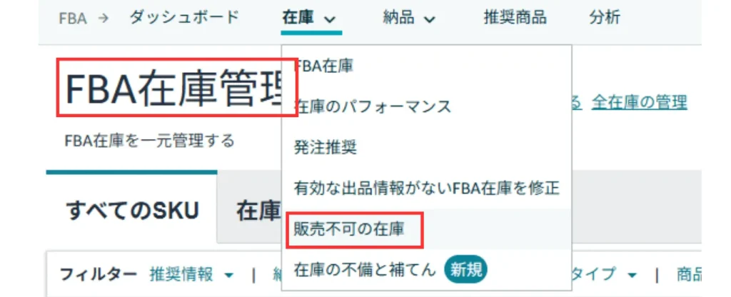②「FBA在庫管理」画面で、上記の「在庫」タグメニューの「販売不可の在庫」をクリックします。