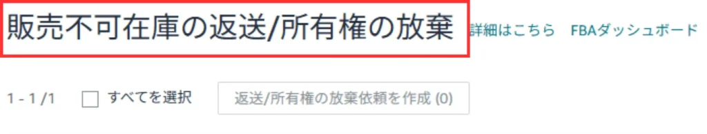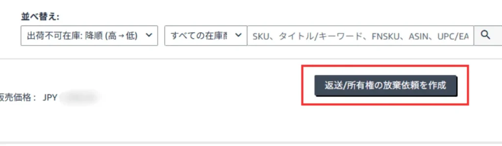 ③「販売不可在庫の返送/所有権の放棄」画面で、該当商品(該当FNSKU)の右端にある「返送/所有権の放棄依頼を作成」をクリックします。