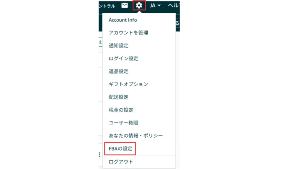 ①セラーセントラルトップページの右上の⚙マークの設定をクリックし、ドロップダウンメニューから「FBAの設定」を選択します。