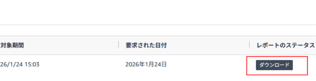 ④レポートのステータスが「ダウンロード」になったらクリックし、ダウンロードする。