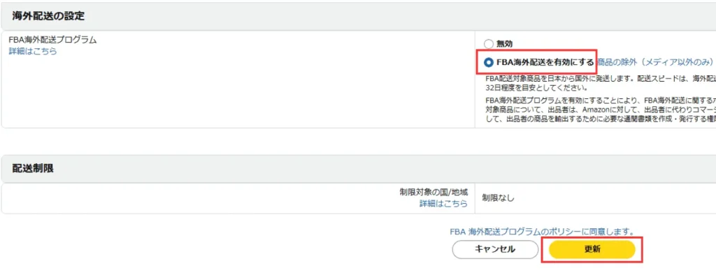 ③「無効」の下の「FBA海外配送を有効にする」を選択し「更新」をクリックすれば、完了です。