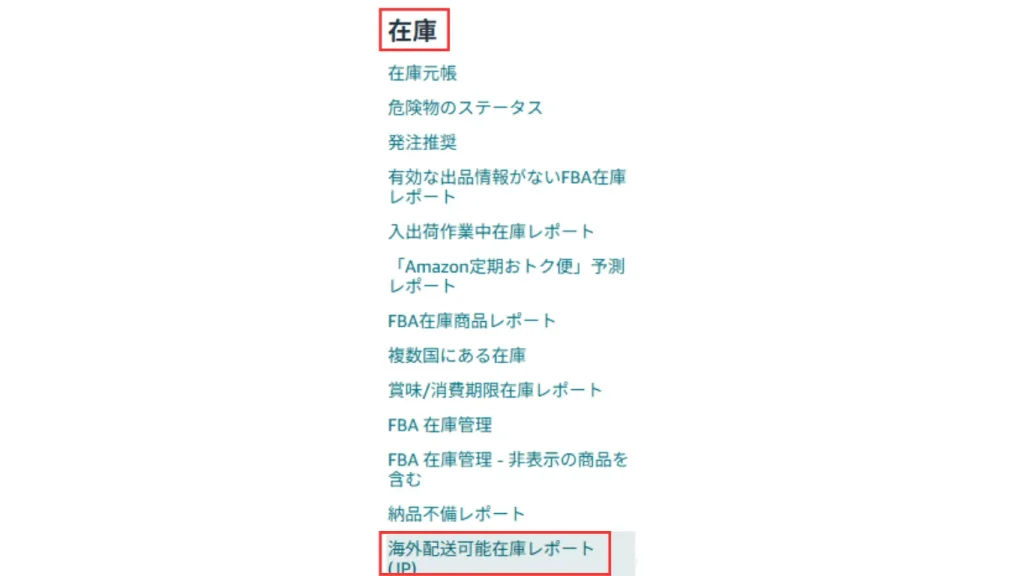 ②左の「在庫」の項目から「海外配送可能在庫レポート(JP)」をクリックする。
