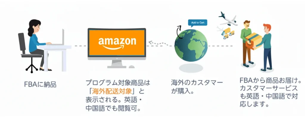 AmazonのFBAを利用されている方が、ほぼノーリスクで手軽に海外販売にチャレンジできるよう、Amazonが厚いサポートで提供する、他にはない優良なサービスです。