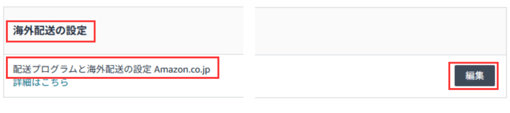 ②スクロールして「海外配送の設定」の「配送プログラムと海外配送の設定Amazon.co.jp」の右端の「編集」をクリックします。
