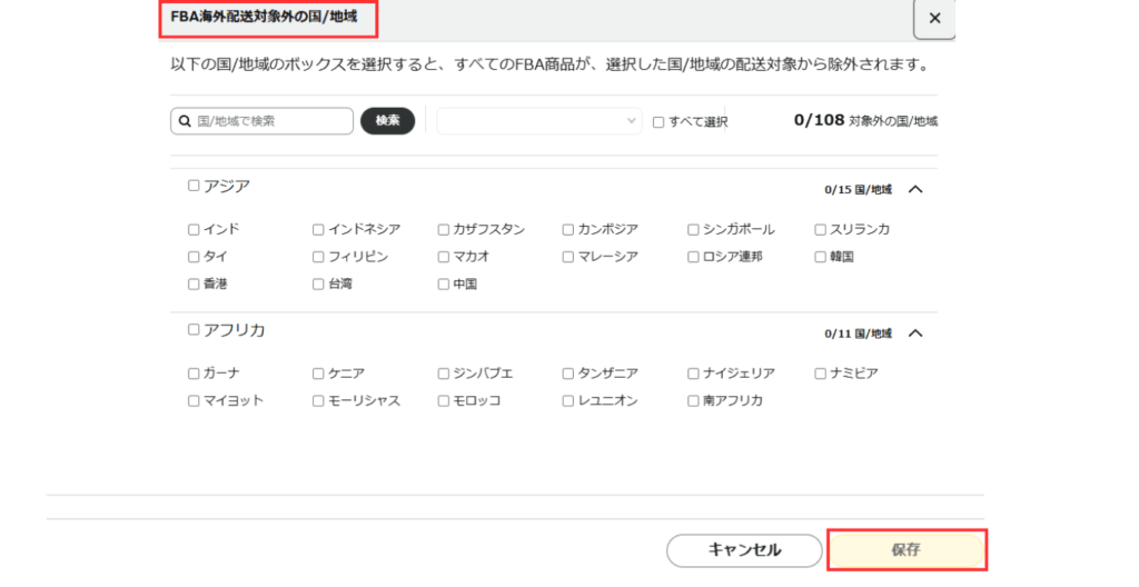 ②「FBA海外配送対象外の国/地域」の一覧画面が表示されますので、除外したい国に✔をいれて「保存」をクリックします。