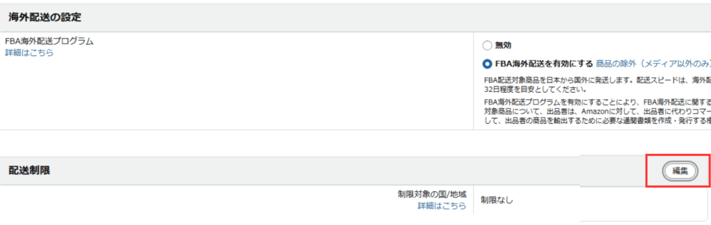 ①「FBA海外配送の設定」の画面で、すぐ下に表示されている「配送制限」の欄の「編集」をクリックします。