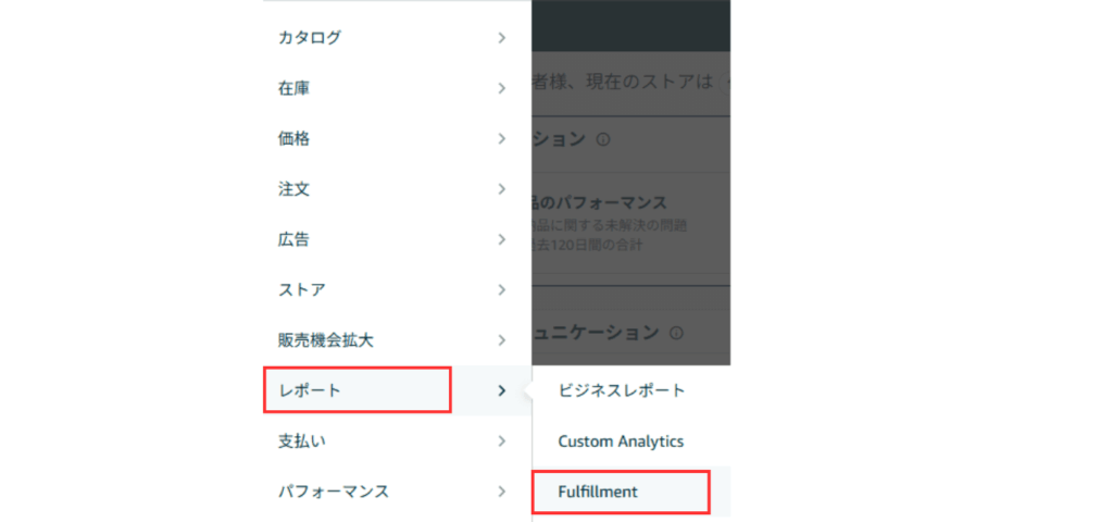 ①セラーセントラルトップページの左上三本のメニューから「レポート」をクリックし、次に「フルフィルメント」をクリックする。