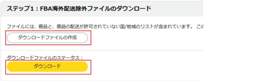 ②「ステップ1:FBA海外配送除外ファイルのダウンロード」の欄の「ダウンロードファイルの作成」をクリックし「ダウンロード」します。