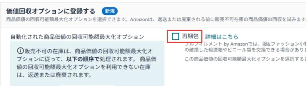 ④「価値回収オプションに登録する」の右下の□再梱包に✔を入れる。