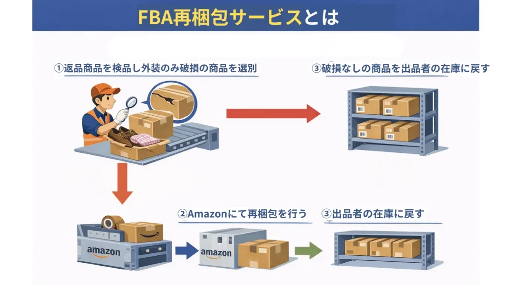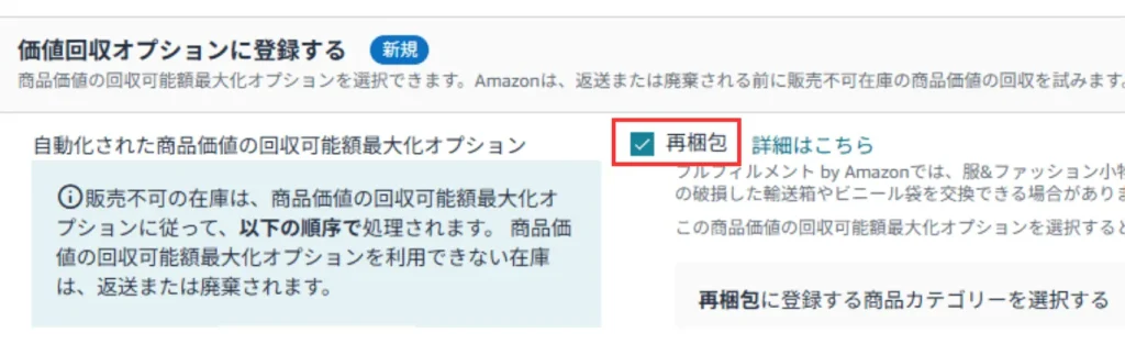 つまり、返品された商品が破損しているのが外装のみで、中身は販売可能である状態の商品に限り、Amazonが梱包をし直して在庫に戻すサービス、ということです。