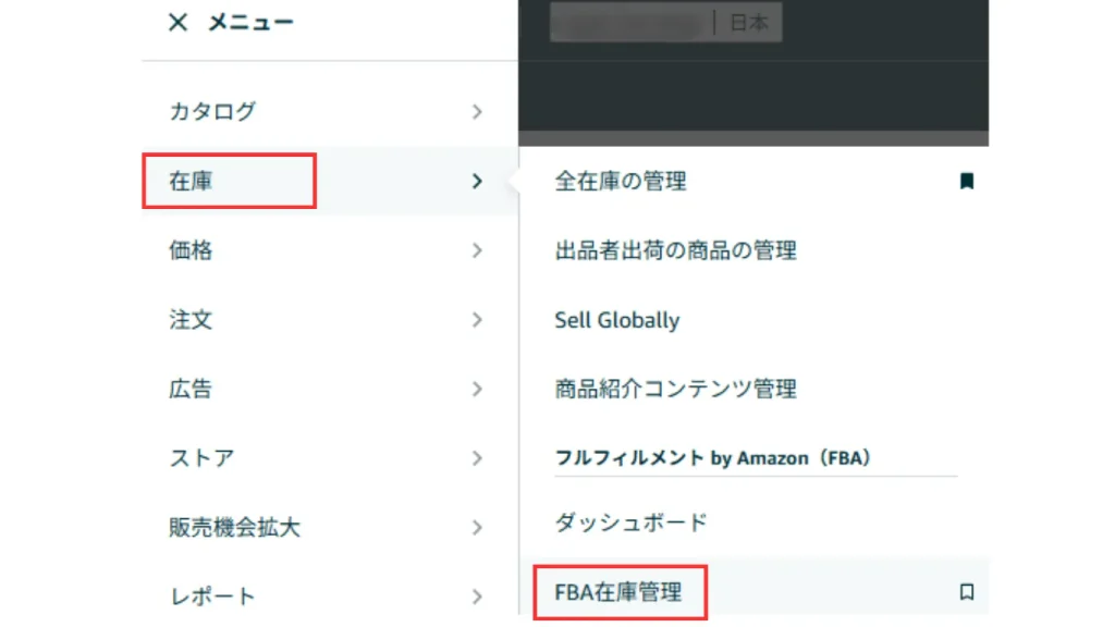 ①セラーセントラルの左上三本のメニューバーより「在庫」▶「FBA在庫管理」をクリック。