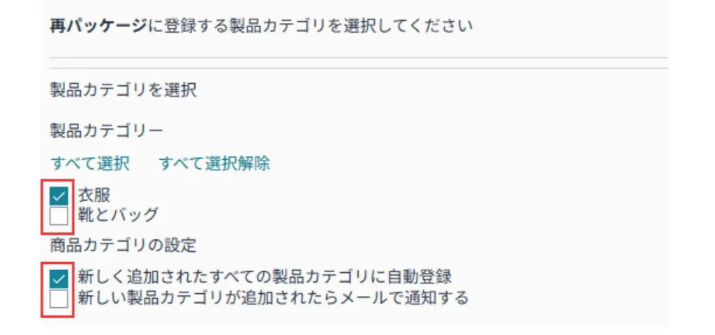 ⑤その下の「製品カテゴリーを選択」の右端Vをクリックし、ドロップダウンメニューから利用したいカテゴリに✔を入れる。
