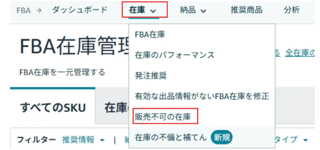 ②「在庫」タグのドロップダウンのなかの「販売不可在庫」をクリック。