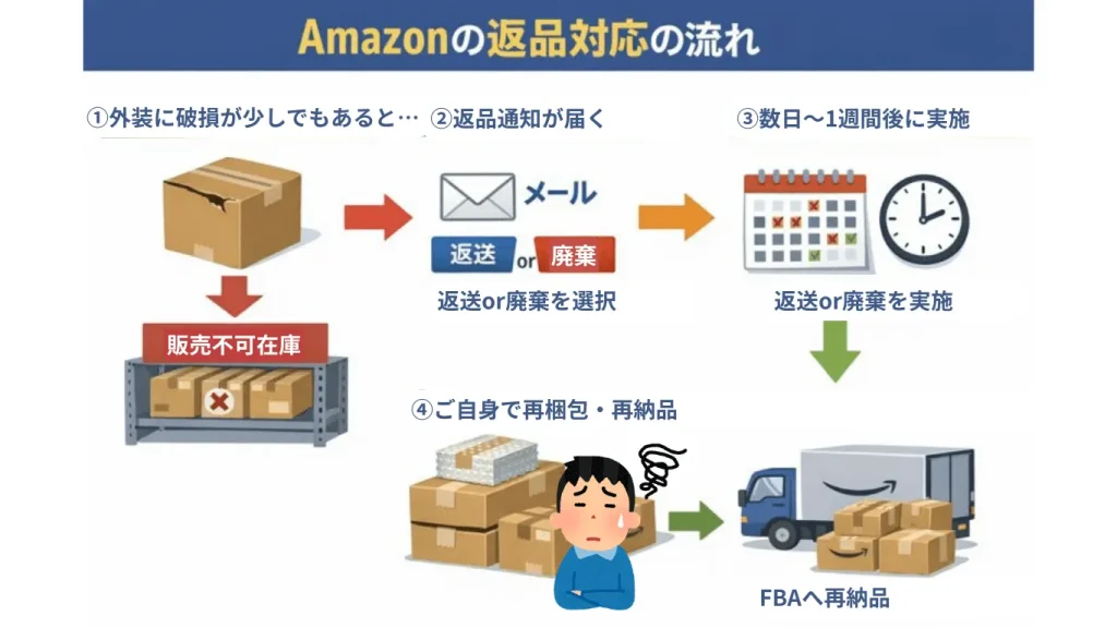一般的な返品処理では、返品された商品自体には破損がない場合でも、外装に少しでも破損があれば「販売不可在庫」に移動され、返送依頼をするしかありません。