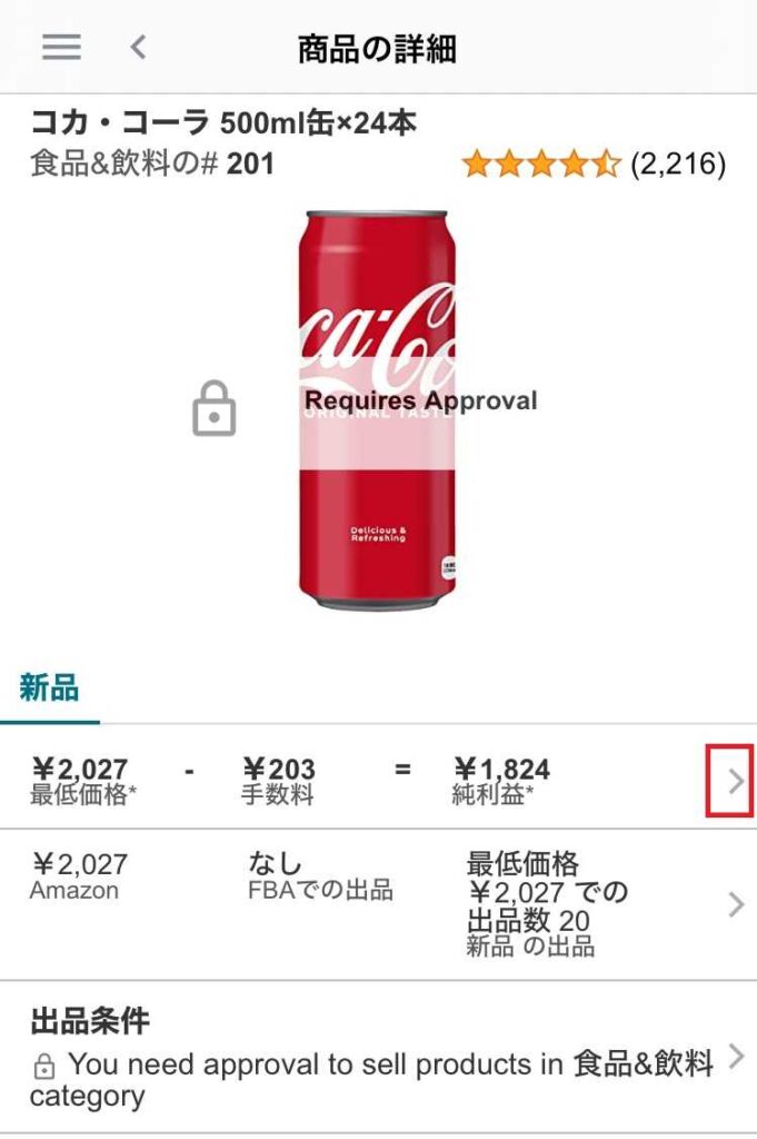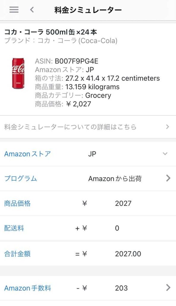 今回のコーラの例でいくと、商品ページのカート価格とFBA料金シミュレーターの価格が2,027円で一致しているため、このまま進めてOKです。